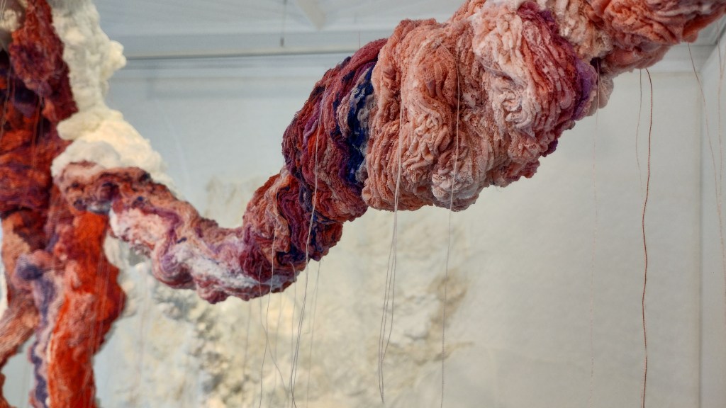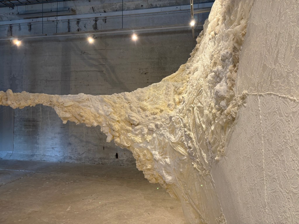 In the exhibition at Format, she presents a new installation titled Alien Fungus. This consists entirely of hand-sewn and hand-dyed lace fabric. The white translucent material seeks to blend into the gallery’s other whiteness, where a flesh-colored “organism” emerges. This organism has eight arms, like the intelligent octopus, our own earthly alien. The alien – as the title refers to – can denote both something exotic and alluring, as well as something invasive. Humanity itself has become an invasive species expanding into new lands and territories, taking over the homes and resources of animals across the globe. The title also refers to art itself on a meta-level; whether it is welcomed or received as an uninvited guest.